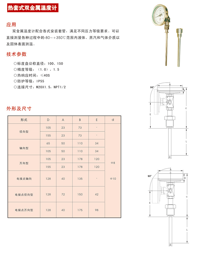 熱套式雙金屬溫度計(jì),雙金屬溫度計(jì)配合各式安裝套管,滿足不同壓力等級(jí)要求。熱套式雙金屬溫度計(jì)可以直接測量各種過程中的﹣80~+350℃范圍內(nèi)液體、蒸汽和氣體介質(zhì)以及固體表面測溫。