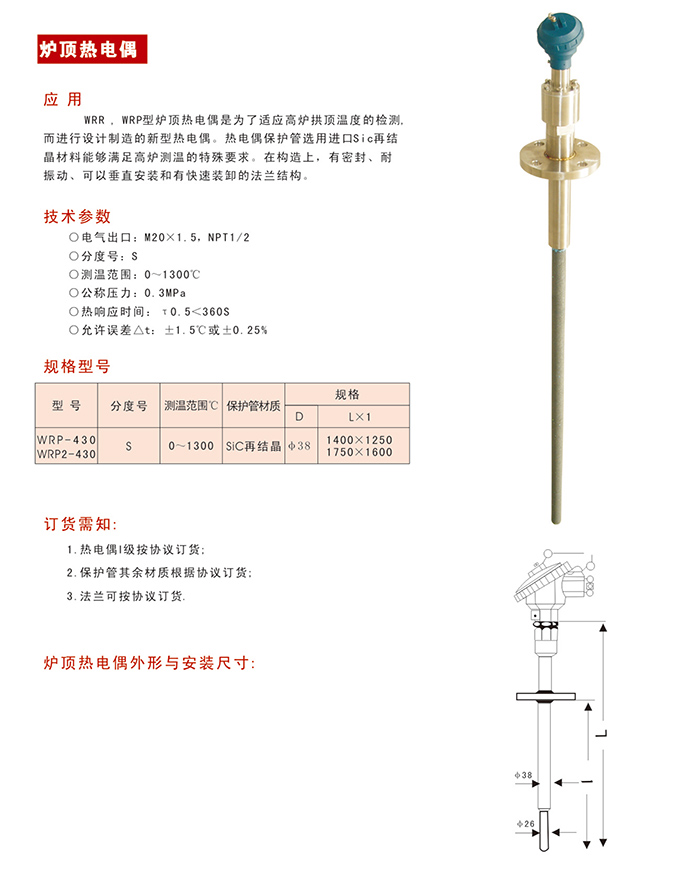 WRR , WRP 型爐頂熱電偶是為了適應(yīng)高爐拱頂溫度的檢 測而進(jìn)行設(shè)計(jì)別造的新熱電偶、熱電偶保護(hù)管選用進(jìn)口 Sic 再結(jié)晶材料能夠滿足高爐測溫的特殊要求,在構(gòu)造上,有密封、耐振動,可以垂直安裝和有
