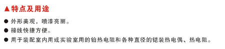 電線管與接線盒連接,線管里面的電線在接線盒中連起來,起到保護電線和連接電線的作用。熱電偶和熱電阻接線盒是用來固定接線座和作為連接器的裝置,它起著保護感溫元件免受外界氣氛侵蝕和使外接導線與接線柱接觸良好的作用,根據(jù)被測量溫度對象和現(xiàn)場環(huán)境條件及要求,除了普通型接線盒外,還有防濺型、防水型、防爆型、接插型、不銹鋼、塑料和一體化溫度變送器等接線盒。我們如果將各種類型的接線盒裝配成熱電偶和熱電阻產品,則這些產品相應即為防濺型、防水型和接插型等熱電偶和熱電阻了。