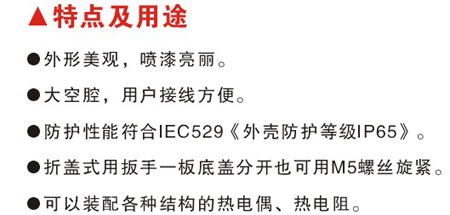 電線管與接線盒連接,線管里面的電線在接線盒中連起來(lái),起到保護(hù)電線和連接電線的作用。熱電偶和熱電阻接線盒是用來(lái)固定接線座和作為連接器的裝置,它起著保護(hù)感溫元件免受外界氣氛侵蝕和使外接導(dǎo)線與接線柱接觸良好的作用,根據(jù)被測(cè)量溫度對(duì)象和現(xiàn)場(chǎng)環(huán)境條件及要求,除了普通型接線盒外,還有防濺型、防水型、防爆型、接插型、不銹鋼、塑料和一體化溫度變送器等接線盒。我們?nèi)绻麑⒏鞣N類(lèi)型的接線盒裝配成熱電偶和熱電阻產(chǎn)品,則這些產(chǎn)品相應(yīng)即為防濺型、防水型和接插型等熱電偶和熱電阻了。