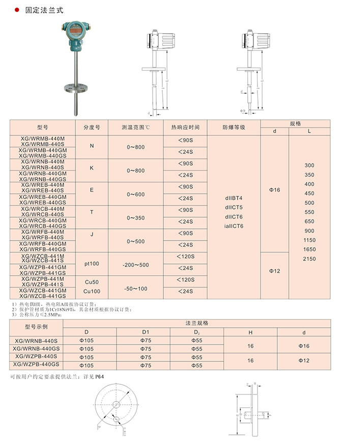 固定法蘭式,現場顯示一體化熱電偶(阻)一種新型結構的測溫儀表,現場LCD或LED數字顯示,溫度變送器二線4~20mA.DC信號輸出,感溫元件可采用鎧裝壓簧式抗震結構,感溫元件與上保護管采用圓筒隔爆結