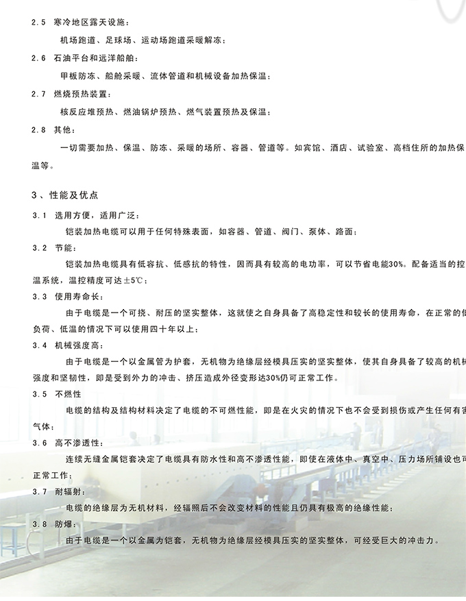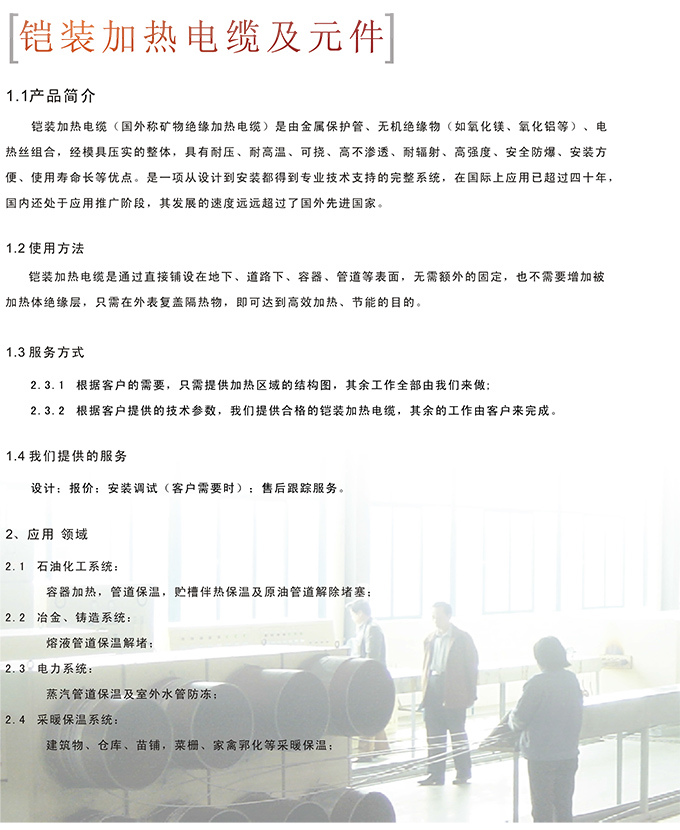 鎧裝加熱電纜(國外稱礦物絕緣加熱電模)是由金屬保護管,無機絕緣物(如氧化鎂,氧化鋁等),電熱絲組合,經模具壓實的整體,具有耐壓、耐高溫、可撓,高不滲透,耐輻射,高強度、安 全防爆、
