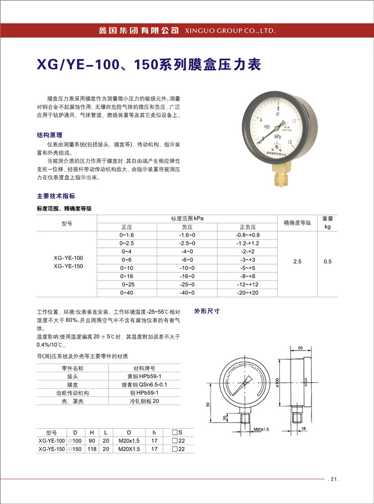 XG / YE -100、150系列膜盒壓力表: