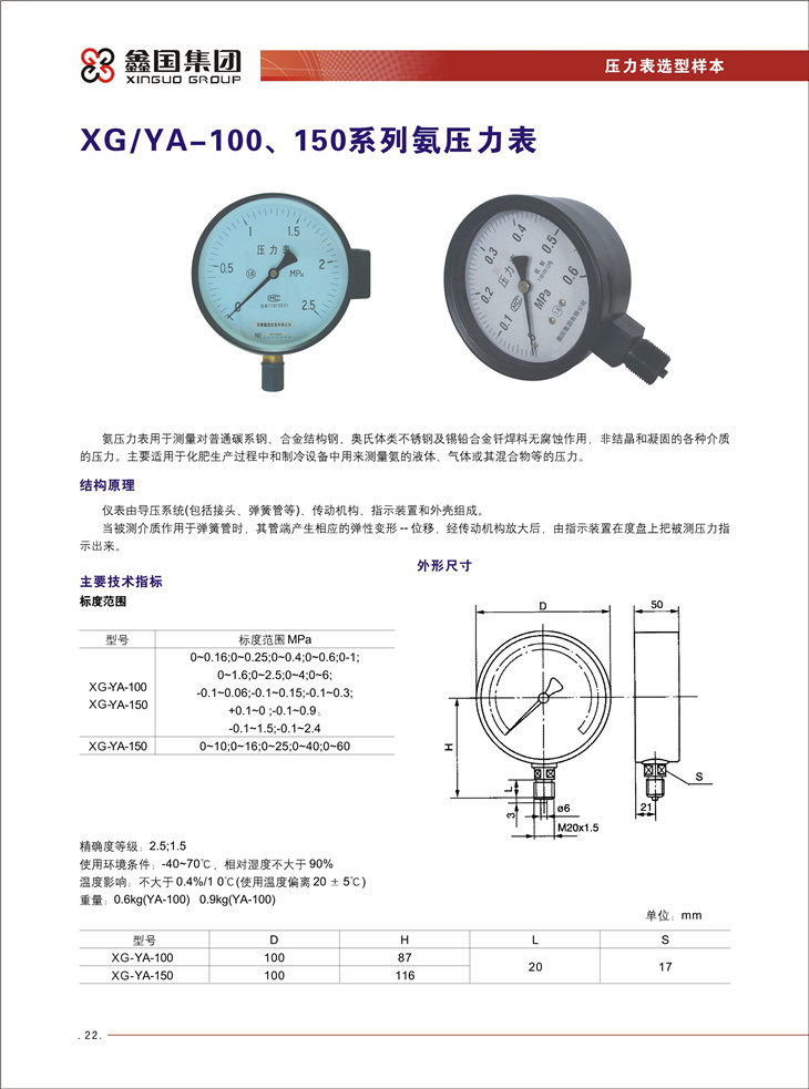 XG-YA-100/150系列氨壓力表,氨壓力表用于測量對普通碳系鋼,合金結構鋼,奧氏體類不銹鋼及錫鉛合金釬焊料無腐蝕作用,非結晶和凝固的各種介質的壓力。氨壓力表主要適用于化肥生產過程中和制冷設備中用來測量氨的液體,氣體或其混合物等的壓力。