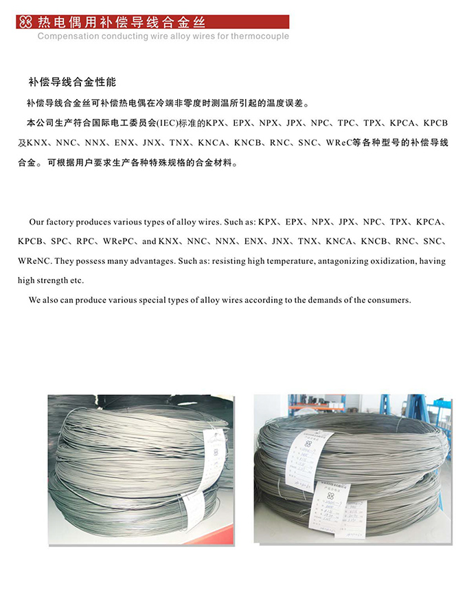 本公司生產(chǎn)符合國(guó) 際電工委員會(huì)( IEC )標(biāo)準(zhǔn)的 KPX、EPX、NPX、JPX、NPC、TPC、TPX、KPCA、KPCB及KNX、ENX、NNX、JNX、NNC、TNX、KNCA、KNCB、RNC、SNC、LNX、WReC 等各種型號(hào)的補(bǔ)償導(dǎo)線合金絲??筛鶕?jù)用戶要求生產(chǎn)各種特殊規(guī)格的合金材料。