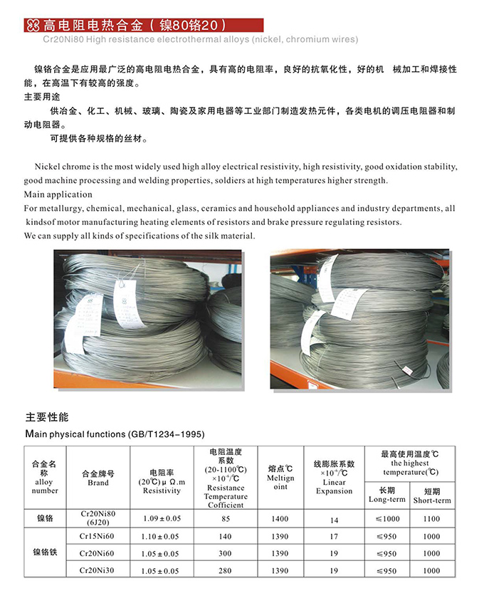 高電阻電熱合金,供冶金、化工、機械、玻璃、陶瓷及家用電器等工業