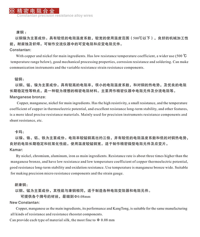 高電阻電熱合金,供冶金、化工、機械、玻璃、陶瓷及家用電器等工業部門制造發熱元件,各類電機的調壓電阻器和制動電阻器。
