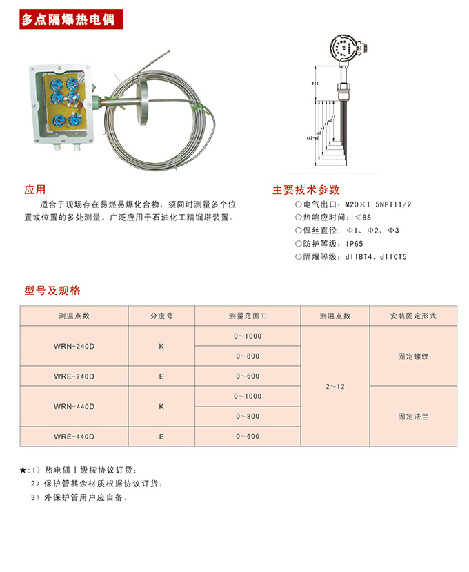 多點防爆熱電偶,適合于現場存在易燃易爆化合物,須同時測量多個位置或位置的多處測量。多點防爆熱電偶廣泛應用于石油化工精餾塔裝置。