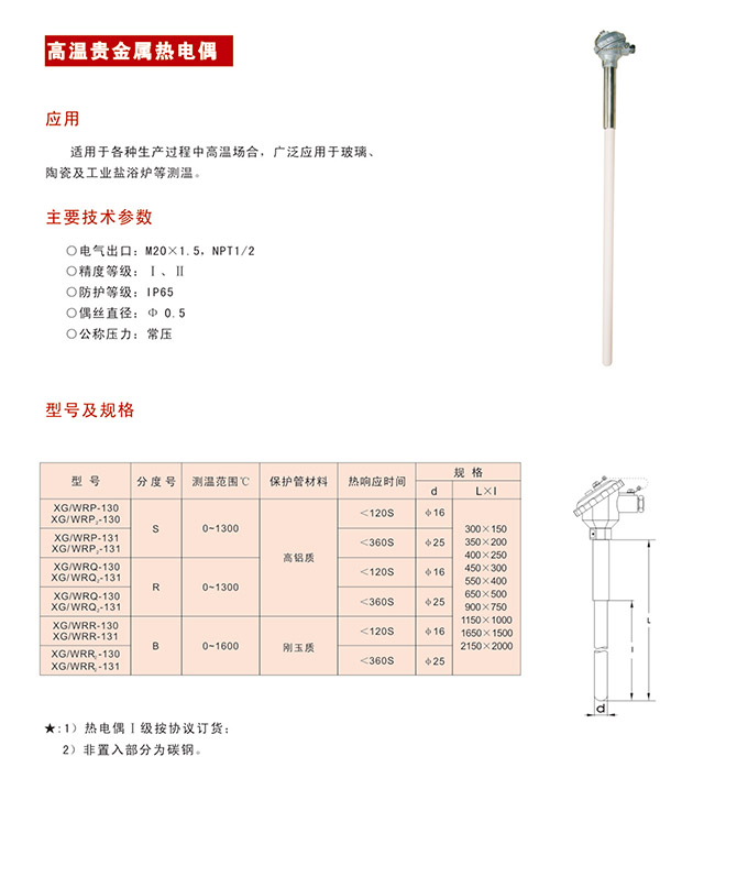 高溫貴金屬熱電偶,適用于各種生產過程中高溫場合,廣泛應用于玻璃、陶瓷及工業鹽浴爐等測溫。