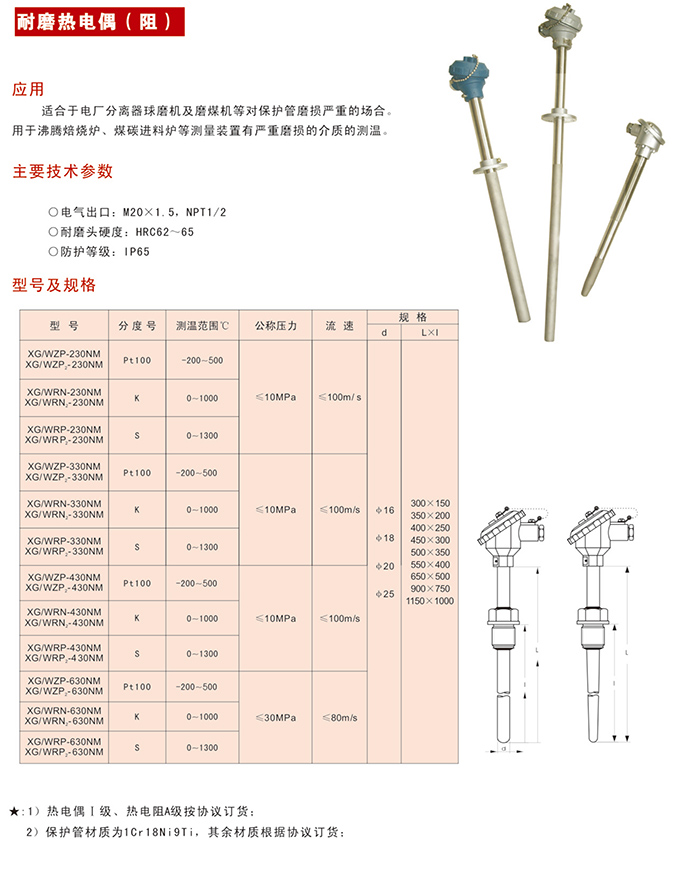 耐磨熱電偶(阻),適合于電廠分離器球磨機及磨煤機等對保護管磨損嚴重的場合。用于沸騰焙燒爐、煤炭進料爐等測量裝置有嚴重磨損的介質(zhì)的測溫。 主要技術(shù)參數(shù): O 電氣出口:M20X1.5,NPT1/2